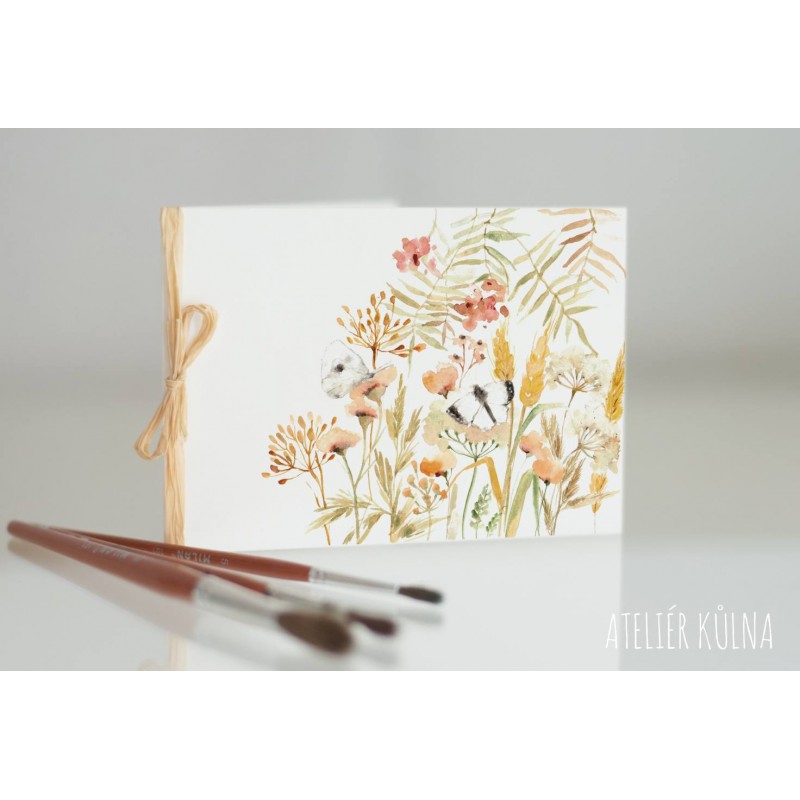 Přání s tiskem autorské malby je velikosti 14,5 x 10,5 cm, papír vyšší gramáže. Převázáno lýkem.