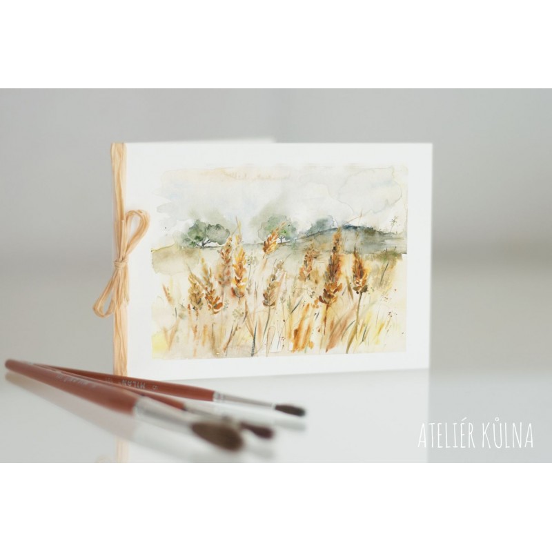 Přání s tiskem autorské malby je velikosti 14,5 x 10,5 cm, papír vyšší gramáže. Převázáno lýkem.