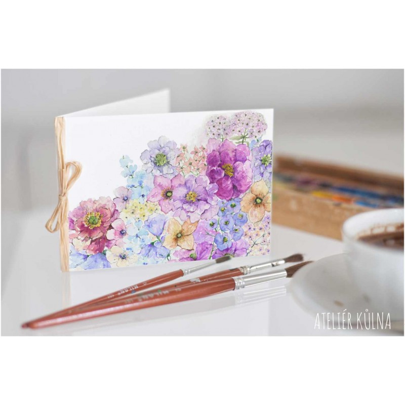Přání s tiskem autorské malby je velikosti 14,5 x 10,5 cm, papír vyšší gramáže. Převázáno lýkem.