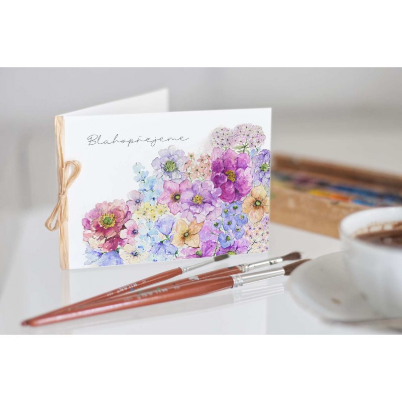 Přání s tiskem autorské malby je velikosti 14,5 x 10,5 cm, papír vyšší gramáže. Převázáno lýkem.