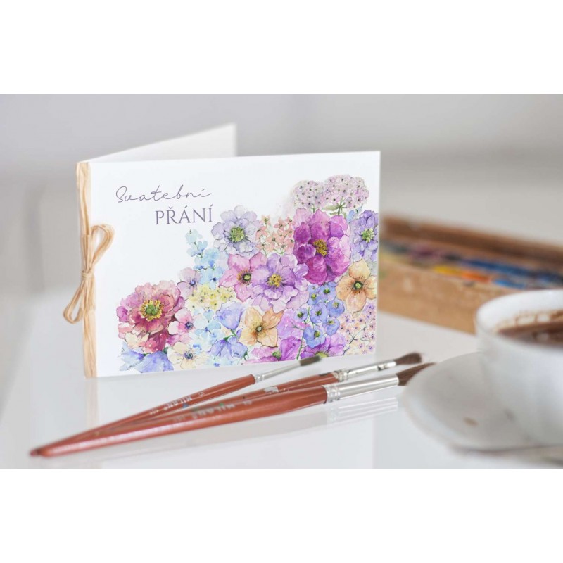 Přání s tiskem autorské malby je velikosti 14,5 x 10,5 cm, papír vyšší gramáže. Převázáno lýkem.