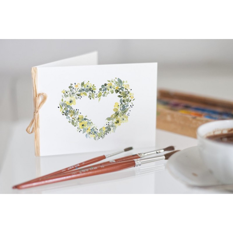 Přání s tiskem autorské malby je velikosti 14,5 x 10,5 cm, papír vyšší gramáže. Převázáno lýkem.