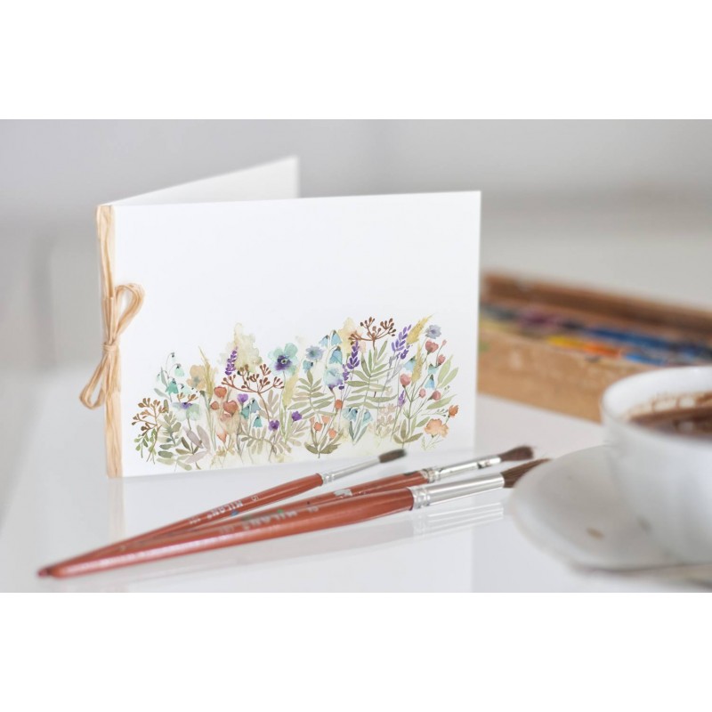 Přání s tiskem autorské malby je velikosti 14,5 x 10,5 cm, papír vyšší gramáže. Převázáno lýkem.