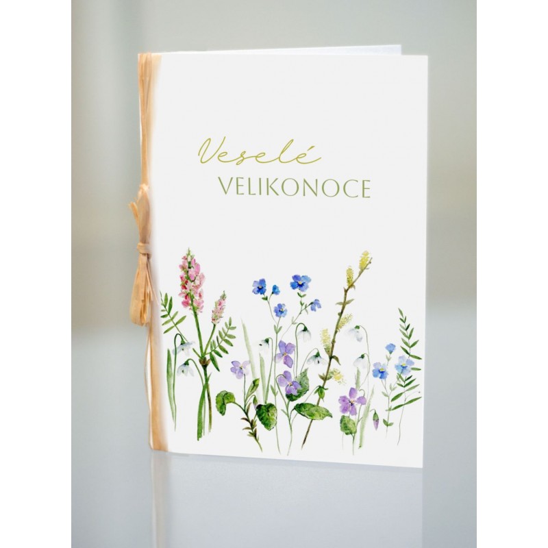 Přání s tiskem autorské malby je velikosti 14,5 x 10,5 cm, papír vyšší gramáže. Převázáno lýkem.
