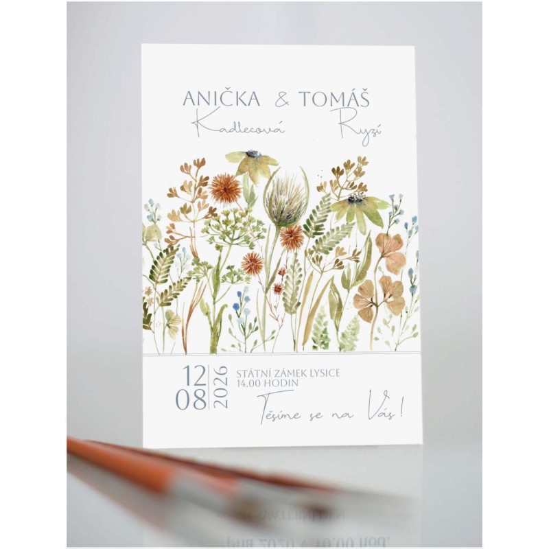 Karta je velikosti 10,5 x 14,5 cm, bílý papír, oboustranně hladký, akvarelový matný, gramáž 220g/m2. Náš autorský motiv.