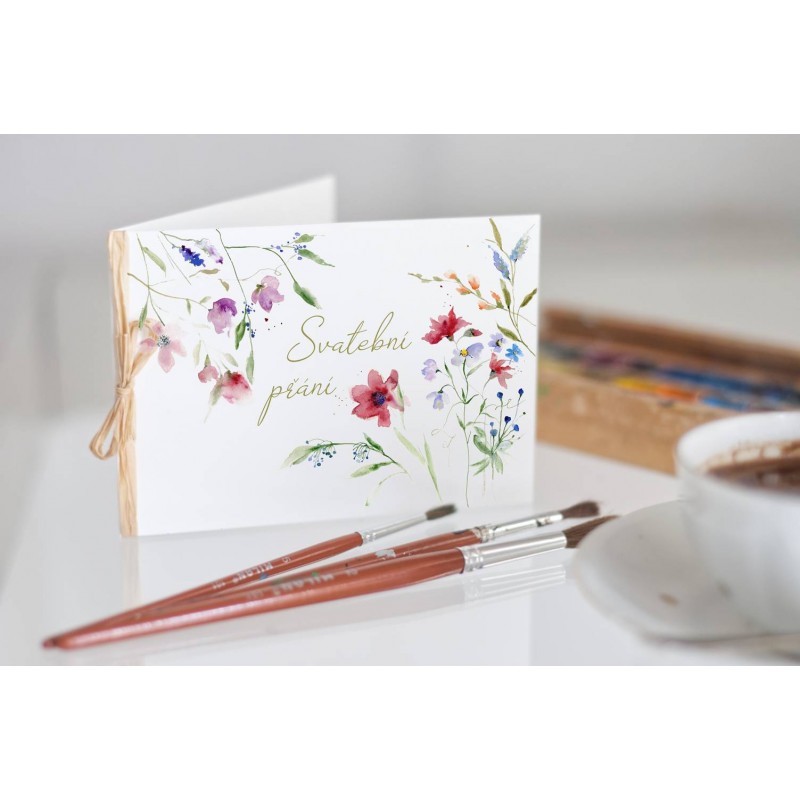 Přání s tiskem autorské malby je velikosti 14,5 x 10,5 cm, papír vyšší gramáže. Převázáno lýkem.