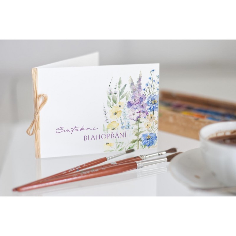 Přání s tiskem autorské malby je velikosti 14,5 x 10,5 cm, papír vyšší gramáže. Převázáno lýkem.