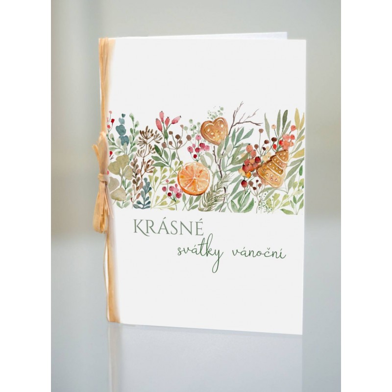 Přání s tiskem autorské malby je velikosti 14,5 x 10,5 cm, papír vyšší gramáže. Převázáno lýkem.
